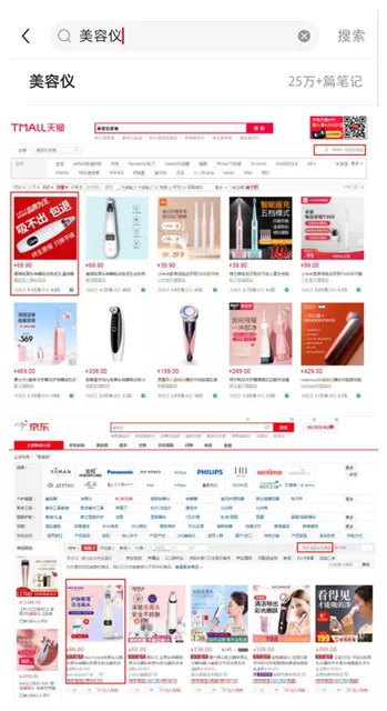 青眼以“美容仪”为关键词在小红书上进行搜索,显示相关笔记多达25万条,且部分热门笔记下,显示相关产品已有上万人种草收藏。在天猫平台上,以“美容仪 家用”为关键词的相关商品共有19457件,其中销量最高的一款为璐瑶吸黑头仪,月销量为8万件;京东上,则显示共有7.5万件与“美容仪”相关的商品,销量最高的一款产品的累计评价已超过12万条。
