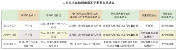 2020年7月出台的《山东省电力现货市场交易规则(试行)》第十二章第九节不平衡资金结算提出:“市场和计划双轨制造成的不平衡资金由所有非市场发电机组及跨省区联络线按照当月上网电量和受电量比例分摊。”