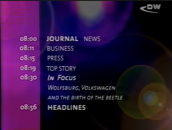与之相对,前网络视频时代的电视节目,也普遍是这个长度。规整的电视时段以 15 分钟左右为单位,30 分钟包含 2 节,60 分钟则为 4 节。不计广告时长,每节在 10-12 分钟左右。90 年代的德国之声电视台,每个小时都被切成两半,整点有新闻,半点是专题节目。而新闻当中又按照头条、简讯、财经、体育、天气等分成 5 分钟的小块。