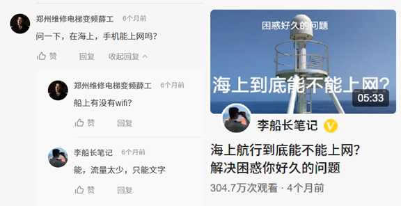 在比较 B 站和西瓜的观众互动时,任利锋以记录航海生活的“李船长笔记”为例说,评论里会有相关专业学生和从业者询问如货轮集装箱吊装技术、集装箱上的编码是什么意思等问题。李船长则会根据大家提供的选题方向做后续的节目。