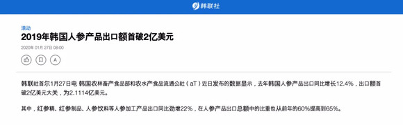 根据韩国人参公社数据显示,韩国人参年总产量超过两万吨,2019年,韩国人参产业市场规模达2万亿韩元,约合人民币120亿元,出口额突破2亿美元大关,其产值是我国人参的10倍。