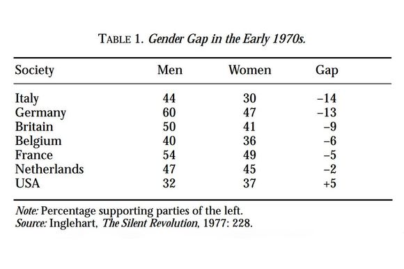 的确,在整个1950年代,美国女性投票支持共和党的可能性比男性更高。在1970年代初期的西欧,男性在投票上的倾向比女性更左。