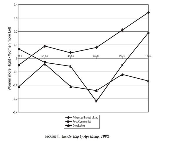 在1990年代,发展中国家的女性(无论其年龄如何)都投票赞成男子的权利,这和40年前美国的情况一样。但是在1990年代的发达工业化世界中,女性在政治上的世代差异是显而易见的: