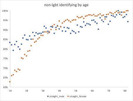 脱离传统性别角色的社会转变,以及这种转变引起的文化流变,都还远未结束。正如丽贝卡·特赖斯特(Rebecca Traister)论证的那样,正在成长起来的一代美国女性中,单身现象日益普遍,而这代女性是当代政治中最强大的力量之一。2009年,美国未婚妇女人数超过已婚妇女人数,这是有史以来的第一次。如今,美国的年轻女性不仅单身率高前所未有的高;支持民主党的数据科学家大卫·索尔(David Shor)与《Intelligencer》分享的私人调查显示,她们对异性恋的兴趣前所未有的低。25岁以下的美国女性约30%为LGBT;而在60岁以上的女性群体中,这个数字还不到5%。
