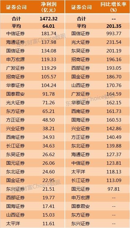 2015年23家上市券商共实现净利润1472.32亿元,平均每家净利润64.1亿元。其中,中信证券净利润达到181.71亿元,稳居第一位,比第二名海通证券的净利润(137.98亿元)高出了43.76亿元,此外国信证券、申万宏源、广发证券、招商证券、华泰证券6家上市券商的净利润也超过100亿元。