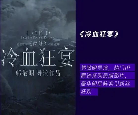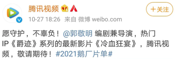 撤档两年后,2020年10月27日,《爵迹2》更名为《冷血狂宴》,赫然出现在了腾讯视频发布的"顶流上新,2021鹅厂片单电影篇"片单之中。
