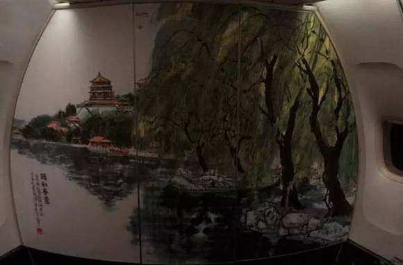 当然,前舱也会有些小惊喜,比如备份机B-2471的机舱隔断上就被画上了一幅国画。画面是颐和园昆明湖的景色。