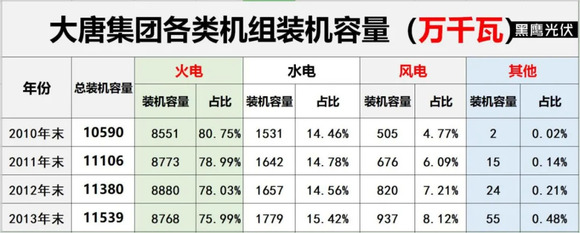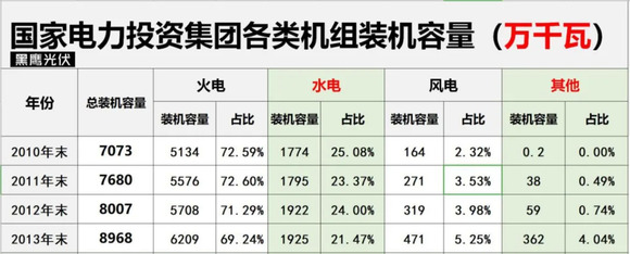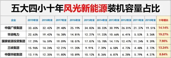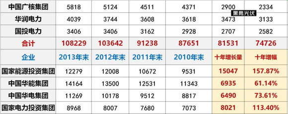 黑鹰光伏特别注:基于电力央企整合重组的变化,本文表格中,国家能源集团2010-2017年数据为原中国国电集团数据,2018-2019年为原中国国电集团与神华集团合并后数据;中国广核集团2011年-2016年风电和太阳能数据分别为2011年11月末、2012年9月末、2014年3月末、2015年3月末、2016年3月末、2016年9月末数据。除华润电力装机容量为权益装机容量外,其他发电集团均是控股装机容量。