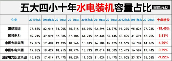 本期内容,黑鹰光伏详细统计分析了从2010年——2019年十年间“五大四小”不同发电品类机组装机结构的组成与变化。我们相信,这样的维度能直观地看出电力央企们在不同发电品类中的布局与进击。也欢迎读者朋友们拍砖、探讨。