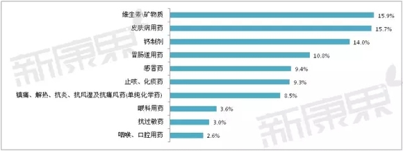 零售药店中外资企业OTC产品以化学药为主,占总销售的84.3%,中成药市场份额仅有15.7%。药品品类主要集中在维生素\矿物质、皮肤病用药、钙制剂等领域。