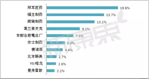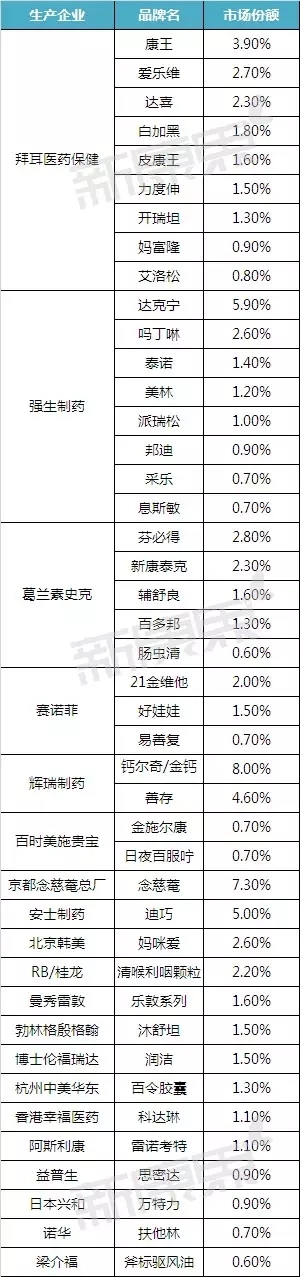 拜耳、强生、辉瑞是中国OTC药品零售市场的三大巨头,单个企业的市场份额均在13%以上。