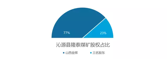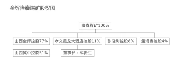 山西金晖原是山西吕梁民营企业家李生贵的家族企业,下属九个实体中有五个煤矿,另有焦化厂、煤焦发运站等其他资产。其中,孝义市万峰、方山县瑞隆、离石区荣泰三个煤矿由山西金晖全资控股;另外的沁源县隆泰和方山县凯川,则有其他小股东参股。尤其是沁源县隆泰煤矿,山西金晖占股77%。