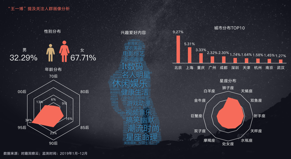 根据时趣洞察引擎对于王一博2019年的粉丝画像分析显示,“王一博”官微粉丝人群中,来自北上广深等一线/新一线城市30岁以下年轻女生是王一博关注主力人群。
