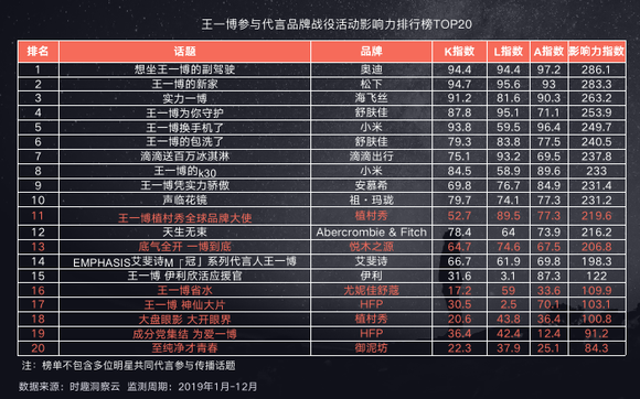 而且在根据时趣洞察引擎对于王一博2019年期间,根据战役活动“KLA“传播效果评估模型,王一博参与代言品牌战役活动传播影响力排行榜中,王一博代言品牌营销战役中,松下、海飞丝、舒肤佳的营销战役实力不俗,各指标影响力均表现优异,有效提升了品牌知名度与影响力。与此同时,美妆护肤品牌类战役传播整体表现较好,有9个营销战役进入榜单TOP20。