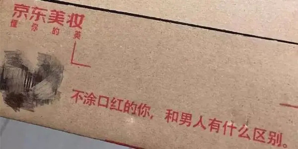 品牌广告通过传播某种理念或宣扬某种文化赋予人们一个消费的理由,当部分广告的理念落后于社会观念发展时,人们便被激怒并开始指责商家为了推动消费无所不用其极。京东快递盒上“不涂口红的你,跟男人有什么分别”引发争议便是一个典型案例。