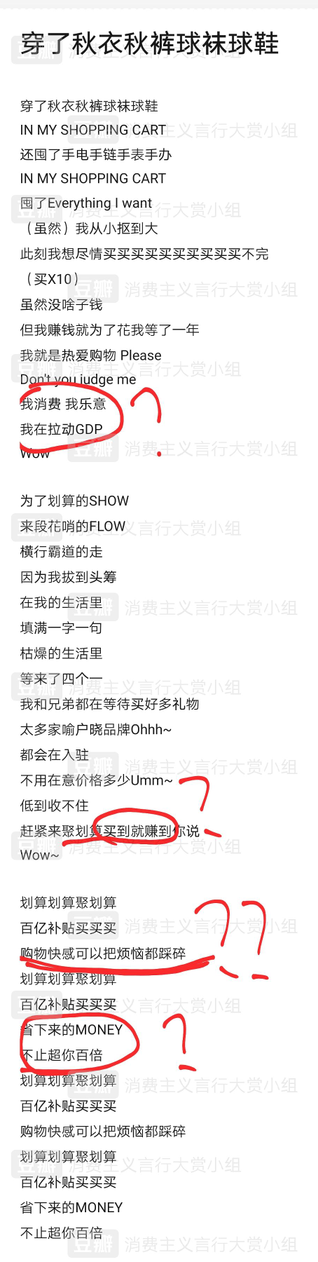 从溢价过高的钻石珠宝奢侈品、潮牌、贵妇化妆品、负离子吹风机等品类到养猫、健身、追星等活动,从野兽派、无印良品等品牌到“不买衣服不化妆,男人凭什么爱你”、根据为女朋友买单划分男友等级、为了鼓励消费而造节、淘宝养猫、聚划算在B站的广告歌词等营销话术和活动,都是小组成员们批判消费主义的靶子。