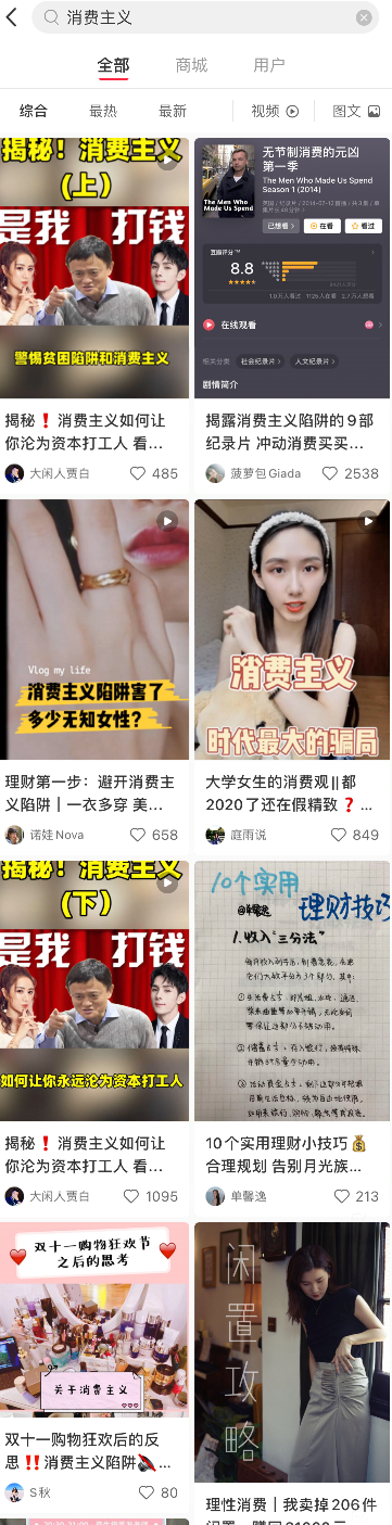 反消费主义的价值观并未局限于B站和豆瓣,而是渗透进了小红书这个都市小资青年的聚集地。关于消费主义骗局、直播间购物、隐形穷人、双十一尾款人的讨论,对理性消费的倡导,相关书籍、纪录片和展览的安利,同样在这里上演。