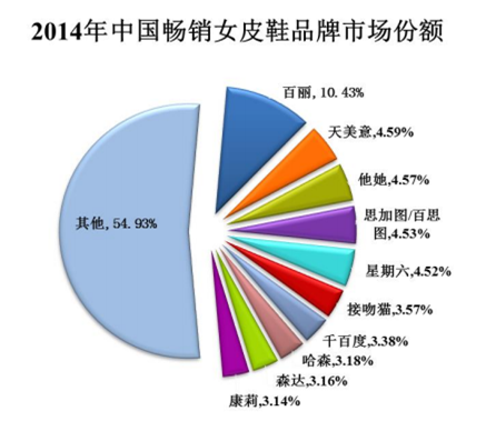 女性市场需求变化较快的特点,恐怕也是当前女鞋市场较为分散的重要原因。截至2014年底,全国排名前十的知名名牌的市场占有率合计也仅为45.07%,排名第一的百丽国际(1880.HK)市场占有率为9.17%,排名第二至第六名之间的品牌总体市场占有率差异并不大。
