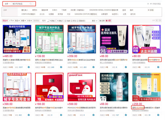 今日,青眼在天猫、小红书等平台上搜索“械字号护肤品”依旧出现了不少商品和种草内容。而这些所谓“械字号护肤品”的生产企业除了医疗器械企业,也包括化妆品企业。