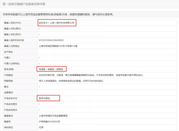 青眼注意到,诸如安且吉兮(上海)医疗科技有限公司等企业的医用冷敷贴等产品近期被取消了备案号。该产品的型号/规格就写着“保湿型;修复型;舒敏型”,显然是不符合备案要求的。