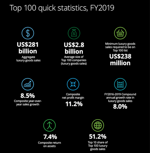 全球排名前100的奢侈品公司的总销售额达到2810亿美元,较去年同期增长340亿美元。按调整后汇率计,同比增长8.5%,增幅低于去年的10.8%;