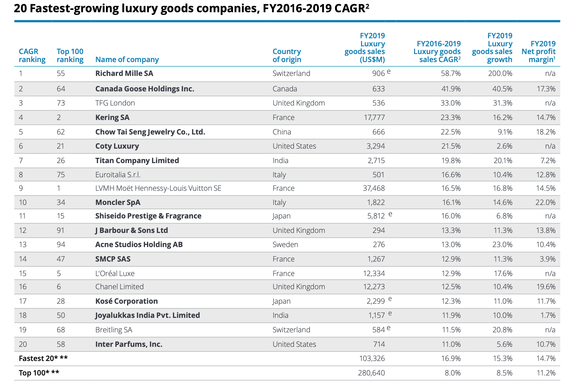 基于各公司2016~2019年的复合年增长率,德勤还给出了增长最快的20家奢侈品公司榜单。
