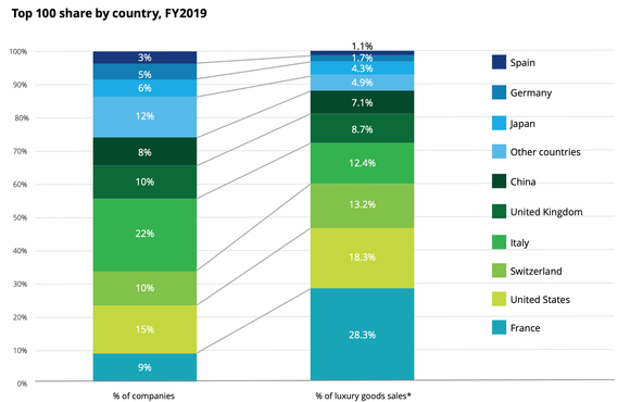 上榜的意大利奢侈品公司数量最多;法国公司表现最佳,销售额复合增长率为15.7%,在100强中销售额占比最大,达到28.3%;
