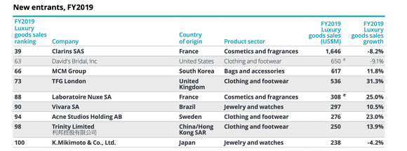 法国美妆公司 Clarins(娇韵诗)(39)、美国服装鞋履公司 David’s Bridal(63)、韩国包袋配饰集团 MCM Group(66)、英国时尚集团 TFG London(73)、法国美妆集团 Laboratoire Nuxe(88)、巴西珠宝腕表公司 Vivara(90)、瑞典时尚公司 Acne Studios Holdings(94)、中国利邦控股有限公司(98)、日本珠宝公司 Mikimoto(御木本)(100)。