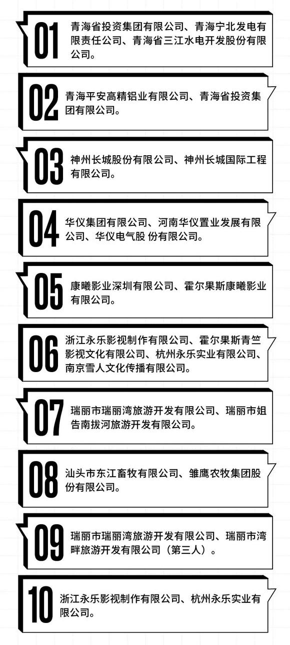 2.华仪集团,*ST华仪(600290.SH)日前发布了关于控股股东资金占用及违规担保事项的进展公告。截至本公告披露日,公司存在关联方资金占用余额为11.4亿元。截至目前,公司及子公司因违规担保承担连带担保所产生的损失累计为7.78亿元。近一年内,*ST华仪累计涉案金额2.35亿元,身背27场官司。