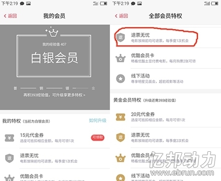 据亿邦动力网了解,该功能详情是指在电影放映前,未取票的用户均可享受这项权益,但每季度仅能使用1次。除此之外,新版本还新增了会员特权,用户可根据会员等级每月获取不同额度的代金券,并可以兑换优酷土豆月卡及参与线下活动。