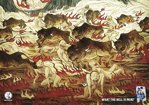 同样是2012年,曼秀雷敦旗下的一款镇痛贴的广告走入人们的视野,令人恐惧的十八层地狱中,受难的人群却是满不在乎的大笑,有了他们的“神贴”,似乎十八层地狱的痛楚也不过如此。作品来自葛瑞(Grey)广告香港公司。