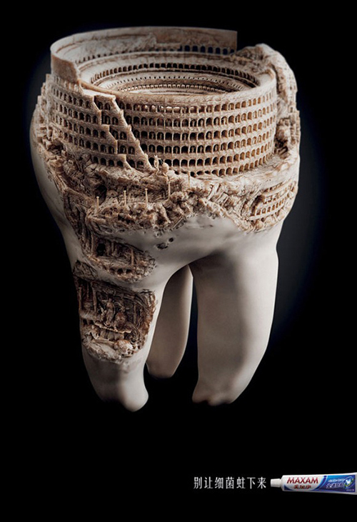 对国人来说,对牙齿的重视仍有不如,如何改变国人这种态度,就成了每一个口腔护理产品的目标。2012年美加净的两幅平面广告,用非常艺术的手段唤起了人们对牙齿损伤的恐惧。