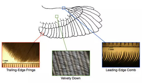 “很多猫头鹰,主要是大猫头鹰,像仓鸮或大灰猫头鹰,能够从高处俯冲下来而不被猎物察觉,隐匿地捕食。”该项目的领导者之一、剑桥大学应用数学以及理论物理系的Nigel Peake教授说,“猫头鹰的翅膀结构能平滑地穿过空气,使声音被散射,达到降低噪声的效果。”