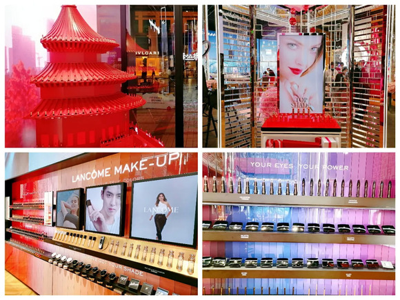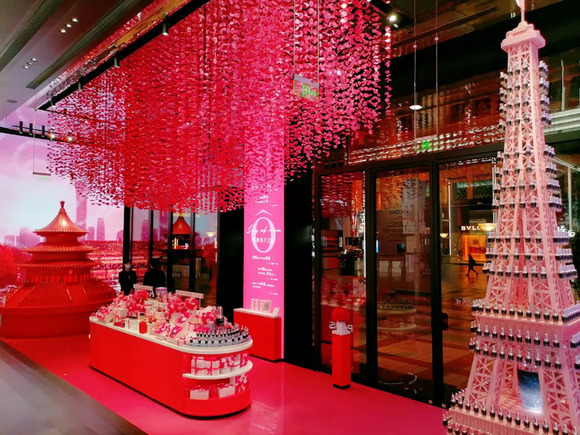 近日,品观APP探店发现,全店采用浪漫粉和中国红作为主色调,综合运用巴黎铁搭、北京天坛、红色玫瑰等经典元素,充分展现中西方文化的同时,也突显了品牌调性;在货品、服务以及陈列方面,店铺综合运用限定、限量,“一对一”服务以及多柜台组合形式,以满足“千人千面”的试妆需求。