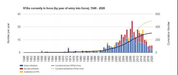 此后,区域贸易协定大行其道,北美自由贸易区、东盟等相继建立,发展到如今的100多个区域贸易协定的规模。在过去相当长的时间里,区域贸易协定基本上主宰着全球贸易,原外经贸部副部长、中国入世谈判首席代表龙永图认为,在某种程度上,现在全球贸易不是按照WTO的规则在进行,而是按照100多个区域贸易协定的安排在进行。