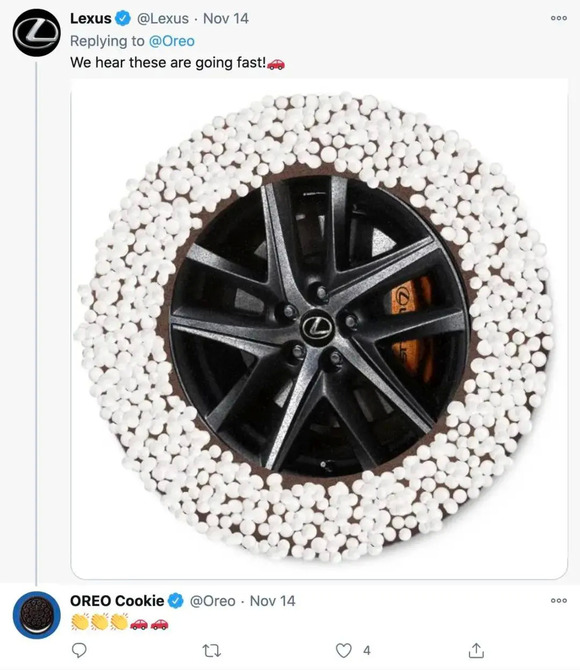 这场 DIY 甚至吸引了不少其他品牌加入,OREOiD 的奥利奥还成了品牌礼品。雷克萨斯用自家轮胎图片定制的 OREOiD 曲奇,非常酷炫,奥利奥瞬间有了新风格。或许,这就是奥利奥进军汽车行业的独特方式?