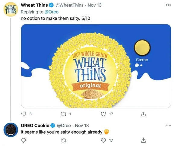 同为饼干品牌的 Wheat Thins 也来设计了一款「黄色奥利奥」,发文不忘吐槽一句「没有让它变咸的选项」。奥利奥也非常幽默地回了一句:「看起来你已经够咸了(偷笑)。」