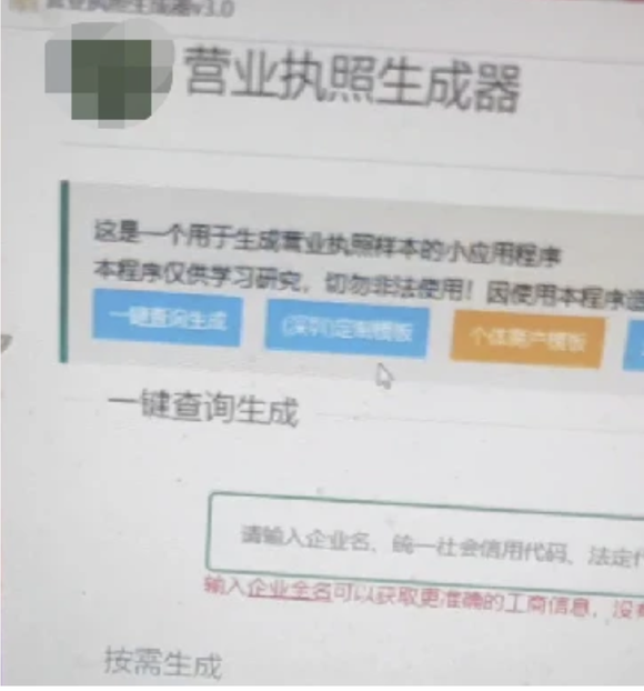 雷达财经调查发现,在有关"58、智联、前程"的交流QQ群中,有卖家出售名为"营业执照生成器"的应用程序。据该卖家介绍,只需输入企业信息,选择模板,就可生成营业执照,且该执照"亲测"可通过58等平台的认证。
