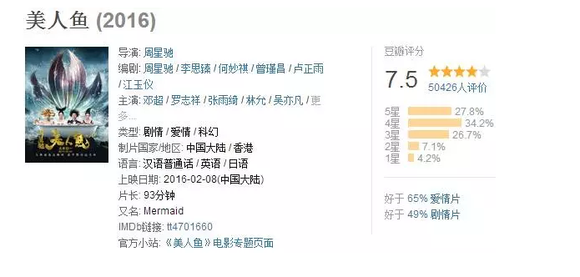 对于这部星爷捂得特别厉害的电影上映后,影评界的出现了两级分化,好的坏的都有。豆瓣上《美人鱼》的评分也不是很高。