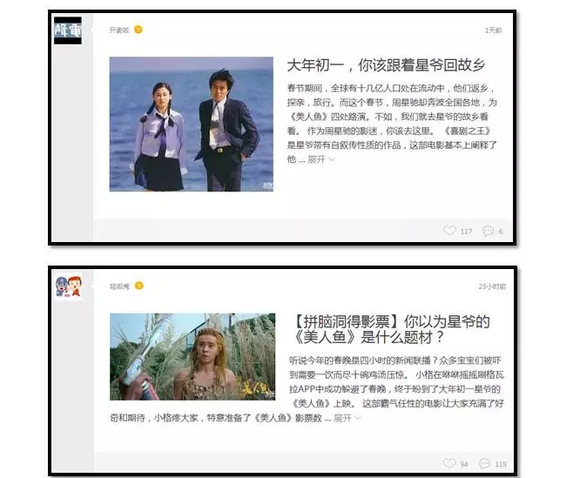 2. 依托「内容营销」放大「周星驰」这块金字招牌的号召力。「年初一,去电影院还星爷的票钱」,这句话想必大家都听得很多吧,而这正是发行团队在用「自来水营销」大打粉丝牌。