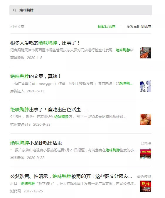 从品牌塑造上来讲,产品研发和人员服务水平控制也会增加难度。如果以“绝味鸭脖”为关键字在某信平台搜索。