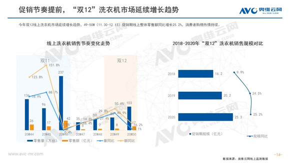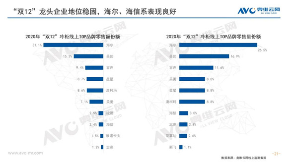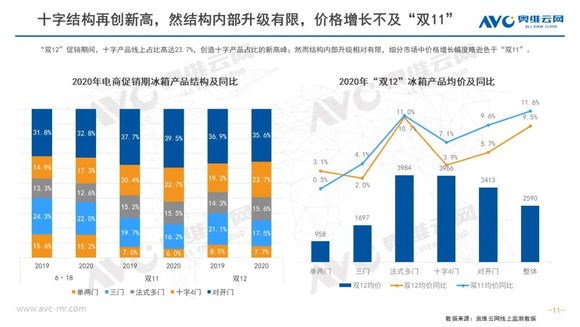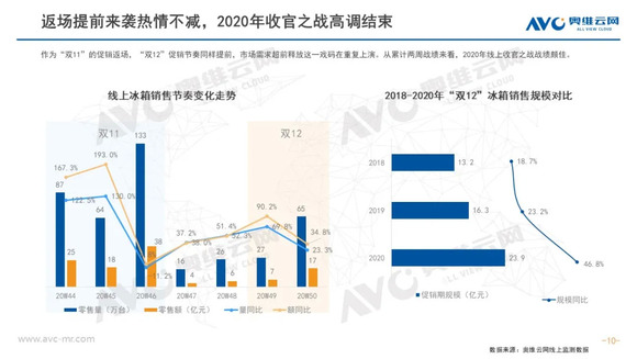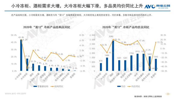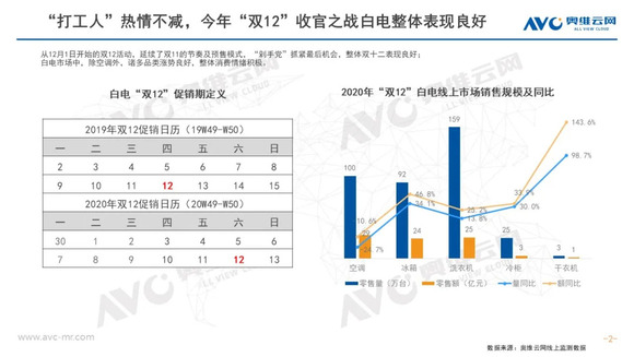 冰箱:2020年冰箱线上市场增长远超预期,双12作为12月份最后一个大型促销节,并没有被寄予厚望。但奥维云网(AVC)线上监测数据显示,双12促销期间,冰箱零售量同比增长34.1%,零售额同比增长46.8%,价格增长9.5%。尽管价格涨幅不及双11,但行业结构性升级趋势仍在,其中十字产品占达23.7%,创下新高;除多温区产品外,大容积市场也处于稳定增长阶段,400L以上产品占比稳步攀升。至此2020年线上市场的促销基本结束,电商渠道的正增长已成定局,价格增长和结构升级这一大趋势则将延续至2021年。
