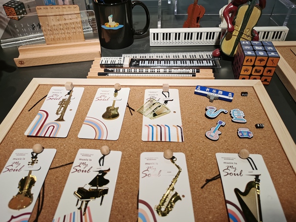 书店的文创选品也以戏剧为主题,包括戏剧魔方、20+1余音刻度尺、电吉他开瓶器、跳跃的琴键、乐器徽章等产品。书店中还有200余种引进文创产品,包括日本文化系列盲盒、意大利品牌Alessandro Coppola的手工琉璃、卡西欧电子乐器、复古黑胶等等。因位于长乐路,店内还为顾客准备了长乐路冰箱贴。