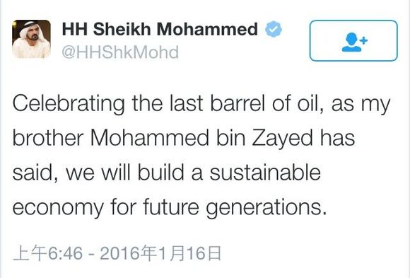 2016年1月,阿联酋总理在推特上写道,“我们为最后一桶石油而庆祝,正如我的兄弟Mohammed bin Zayed所说,我们将为后代建立一个可持续发展的经济体系。”