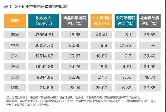 我国税制以间接税为主,直接税为辅。间接税是指纳税人能将税负转嫁给他人负担的税收,如增值税、消费税、关税等,这些税可以通过提高商品售价或劳务价格等办法转嫁出去,最终由消费者负担。直接税指税负不能转嫁,而由纳税人直接负担的税收,如人头税、所得税、土地使用税、房产税等(农业税也属于直接税,但已在2006年全面取消)。我国间接税收入占税收总额之比自1994年分税制改革以来虽有所下降,但仍然在三分之二以上,而直接税尤其是个人所得税占比则较低,2011年的个人所得税改革,提高工资薪金所得减除费用标准,并调整其税率级次级距,2018年再次提高个税起征点,进一步降低了税收收入总额中个税的比重。表1中列出了2015年主要国家税收结构的比较。