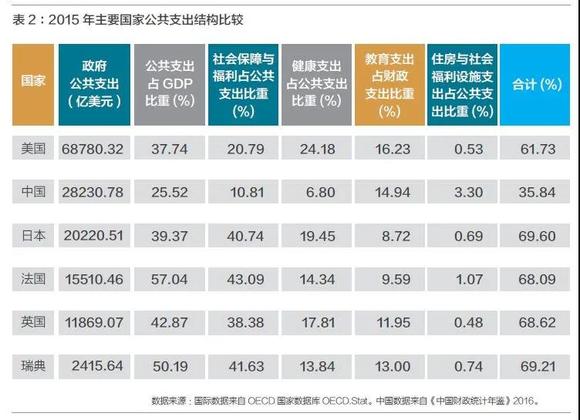 我国的财政支出结构较为完备,涵盖对经济社会发展多方面的支出,主要包括教育支出、社会保障和就业支出、农林水支出、城乡社区支出和一般公共服务支出等。但是,与发达国家相比,中国整体支出结构在医疗、社会保障等方面支出仍然相对较低,表2比较了2015年主要国家的公共支出结构。