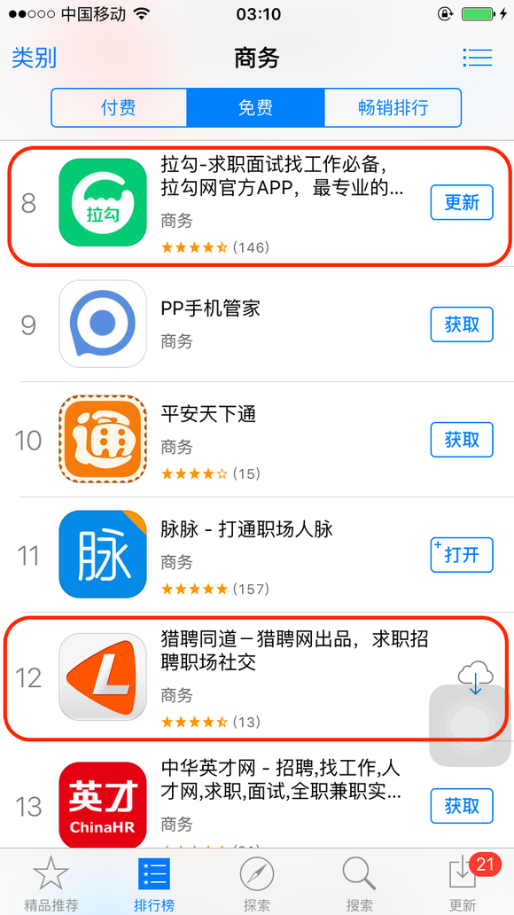 临近求职高峰期,各大招聘网站除了在线下铺张广告,线上的推广力度自然少不了,App Store作为iOS唯一官方渠道,曝光位的抢夺更为激烈,这也是两家不折手段推广的背后深层原因。