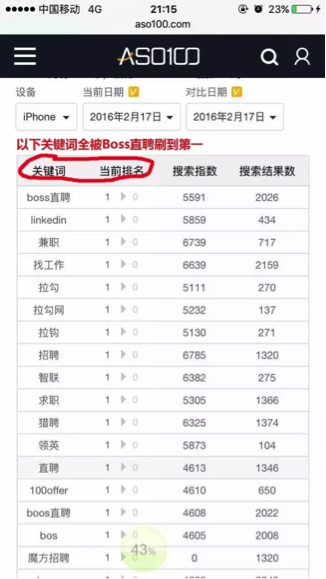 暂且不论机刷关键词排名是否会导致苹果下架,这种操作方式目前在行业内众人皆知,其效果一目了然,远甚于同行业内其他操作方式,操作成本也相对较低,还能达到其它方式无法达到的效果。这或许是Boss直聘采用ASO全套刷的初衷,对于拉勾为何没采用,可能是担心会被下架。