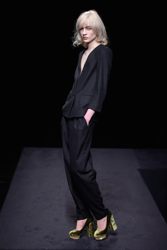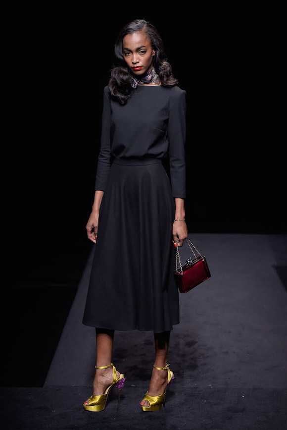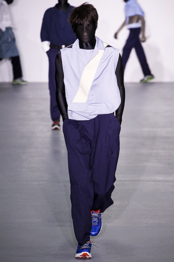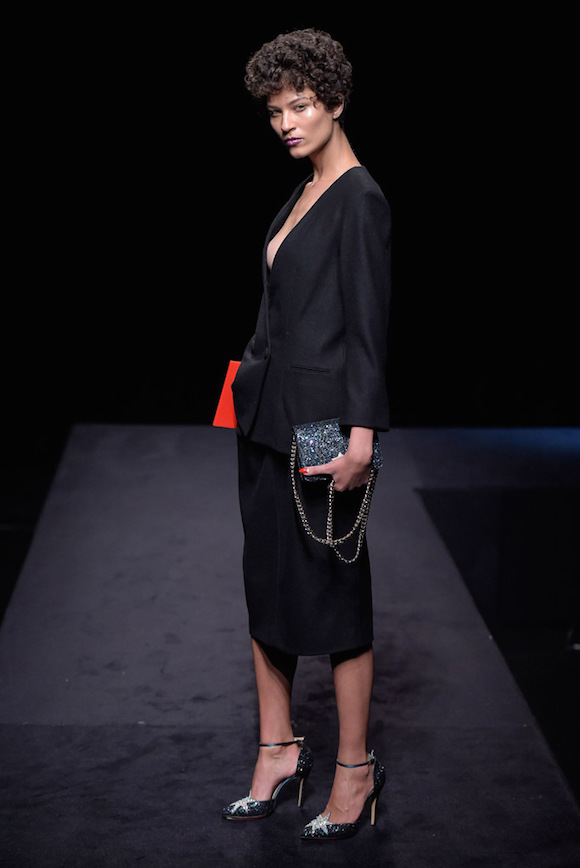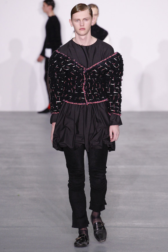 Evans 的设计让人不禁联想到西班牙斗牛士,这从上衣肩膀处的廓形处理,到极度收窄的下身造型里都能看出些端倪。另外,整个系列采用黑、红、白、藏青等颜色为主色调,也能引起观众关于斗牛士的联想。还有一点值得一说,该系列通过手工针织做出的布料,质感上乘,加上颜色的运用恰当,整个系列在整体审美上又提升了一大步。