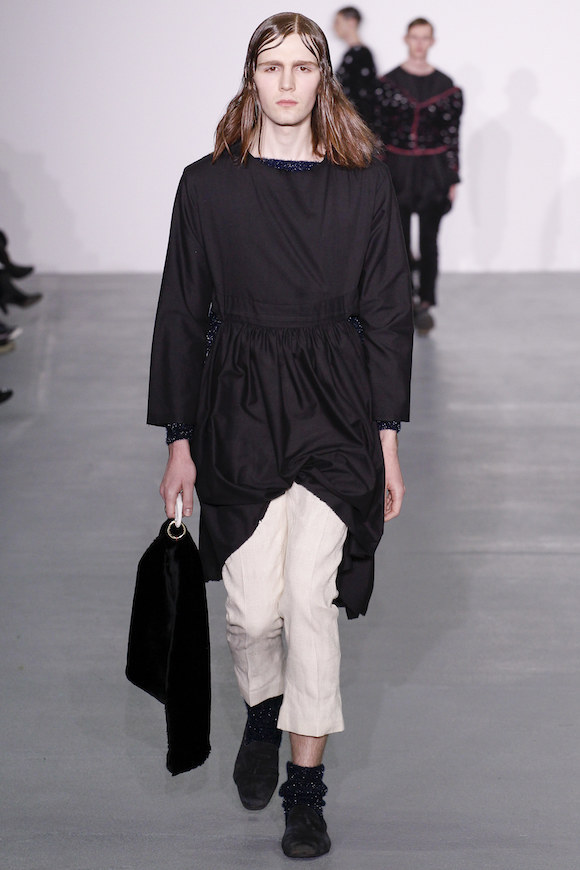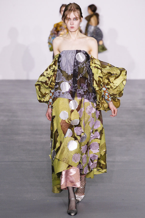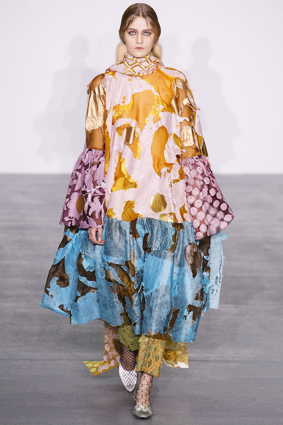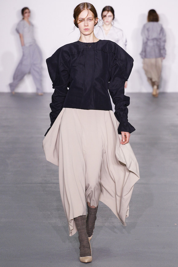 Skelton 的设计则颇有些工业革命时期工人穿衣打扮的味道,不过这些工人更像是受过良好教育的贵族式工人。这听上去有些矛盾,但在造型和选材上都做出夸张处理的工人帽,以及在工装式的成衣上进行的刺绣,都让这两个矛盾事物在现代背景下合理地结合在了一起。对了,根据颁奖词,这一整个系列还使用了环保材料,充分考虑到了时尚和可持续性间的平衡。